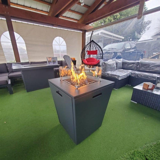 Square Fire Table with Free Glass Wind Guard| CSA Approved | Lid, and Black Glass Stones - 21.5” x 21.5” x 26”