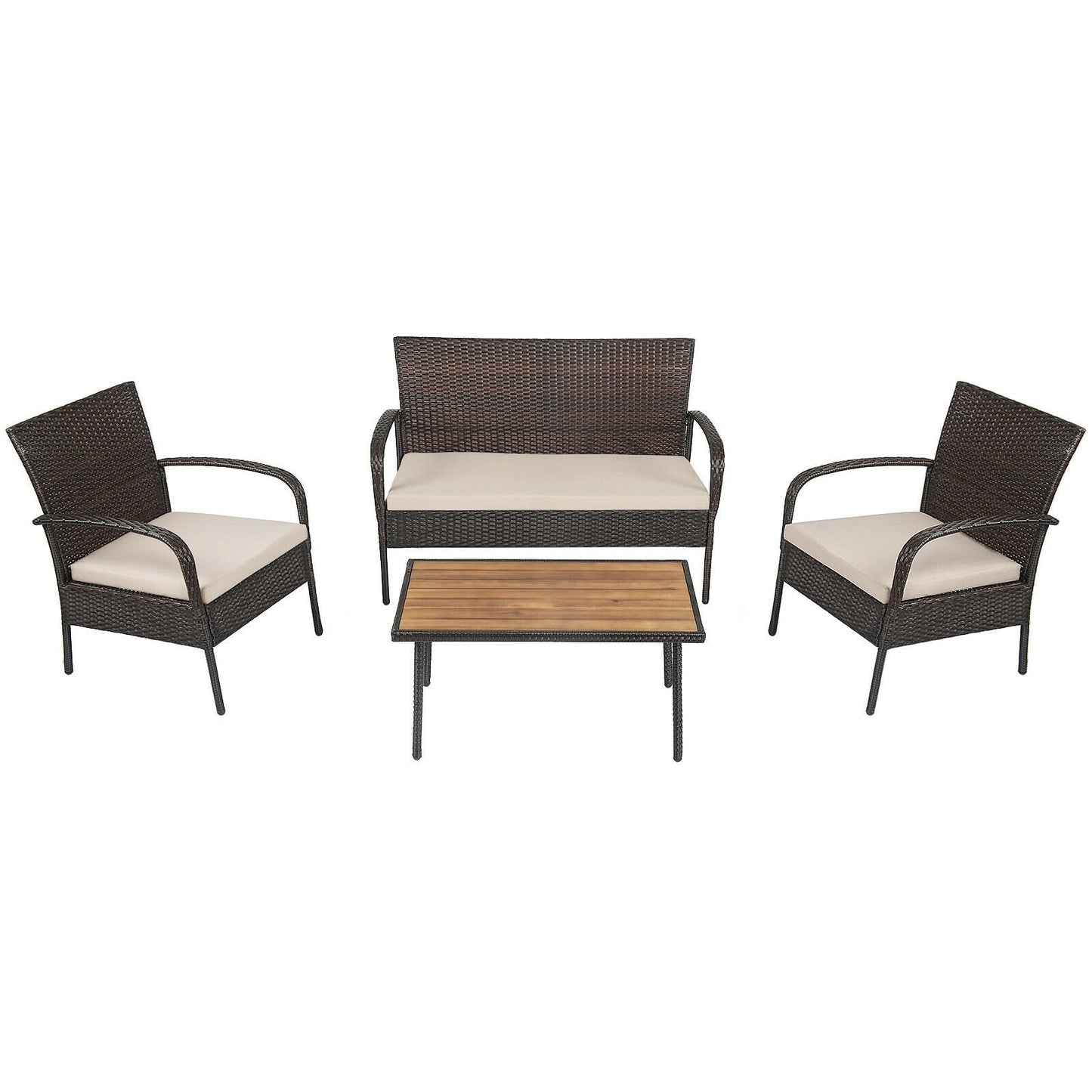 4 Pieces Patio Cushioned Wicker Conversation Set with Acacia Wood Tabletop